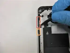 Используйте замок, чтобы поддеть белый пластиковый элемент, который фиксирует кнопки громкости и питания.