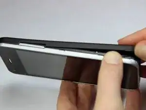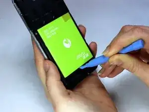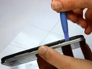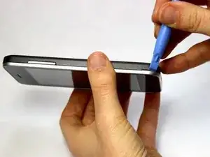 Осторожно проведите пластиковым открывающим инструментом вдоль левой и правой сторон телефона, чтобы отделить черную срединную рамку от серебряного корпуса экрана.
