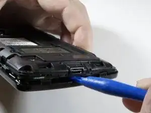 Держите телефон в руке и разместите маленький пластиковый инструмент для открывания или палец под краем телефона рядом с портом USB.