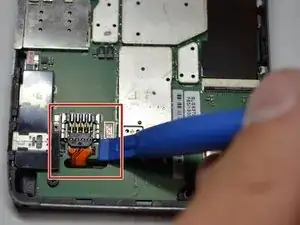 Отключите батарею от материнской платы, поддев пластиковым инструментом рядом с основанием кабеля.