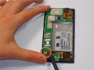 С помощью лопатки аккуратно отсоедините кабель сенсорного экрана. Далее отсоедините кабель дисплея.