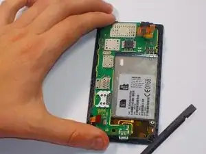 Аккуратно поднимите лопатку, чтобы отделить заднюю крышку телефона от корпуса телефона.