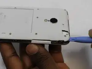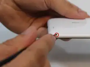 Вставьте пластиковый инструмент для открытия между разъемом зарядки и корпусом устройства. Медленно двигайте инструментом влево, пока не дойдете до верхней части возле кнопки питания.