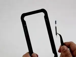 После снятия стекла вы увидите небольшой зажим, прикрывающий соединение экрана с материнской платой в верхней части телефона. Используйте пинцет, чтобы схватить зажим за складку на его стороне и вытащить его.