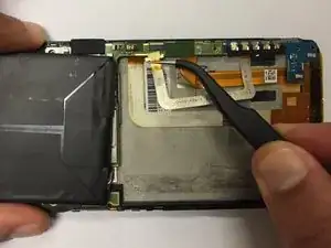 Теперь можно отсоединить гибкий кабель, фиксирующий печатную плату. Аккуратно откройте защелки с помощью пинцета или пластиковой лопатки и сдвиньте гибкий кабель пинцетом.