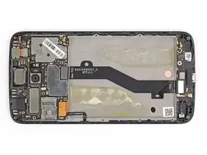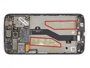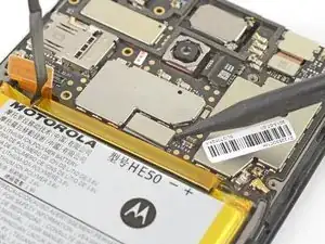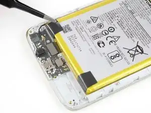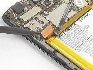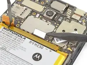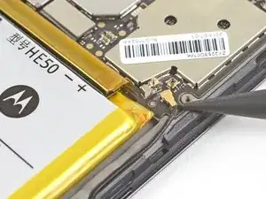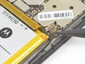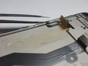 Используйте тонкие пинцеты для отсоединения гибкого кабеля кнопок питания и регулировки громкости. Начните от кромки телефона, как показано на изображении 2, и поднимите вверх. Просуньте пинцеты под гибкий кабель кнопок питания и громкости до золотистой контактной зоны, отсоединив его от телефона.