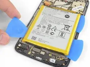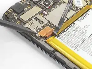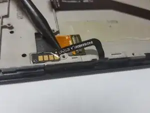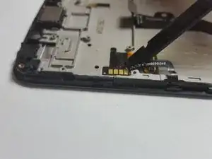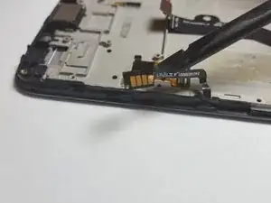 Используйте пластиковую лопатку чтобы полностью приподнять гибкий кабель кнопок громкости и питания от основания телефона.
