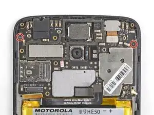 Удалите два чёрных винта T3 длиной 3,2 мм, фиксирующие материнскую плату.