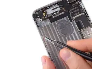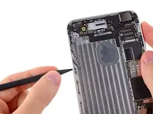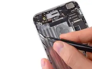 Не поддевайте возле логической платы, иначе вы можете необратимо повредить iPhone. Не поддевайте под верхнюю часть батареи, рядом с кнопкой увеличения громкости и переключателем без звука, иначе вы можете повредить кабель органов управления звуком, который приклеен к заднему корпусу прямо под батареей.