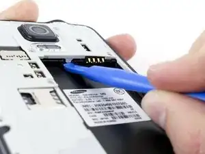 Вставьте ноготь или пластиковый инструмент для вскрытия в углубление в правом нижнем углу батареи и поднимите вверх.