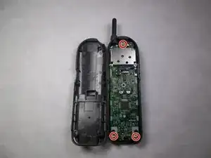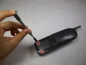 После снятия аккумуляторной батареи BP-T18 вы увидите два винта Philips #0 размером 11 мм, расположенные в нижней части телефона. Удалите оба винта с помощью отвертки.