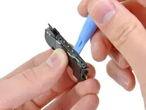 Используйте пластиковый инструмент для поддевания, чтобы извлечь сборку корпусного динамика из корпуса, при этом следите, чтобы не повредить контактные (экранирующие) лапки, прикреплённые к Wi‑Fi антенне.
