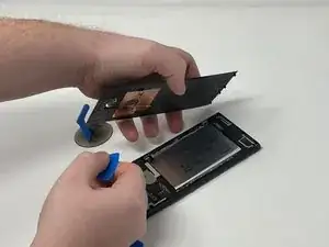 Приклейте присоску к краю телефона и потяните вверх, стараясь создать отверстие достаточно большое для инструмента iFixit.