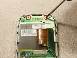 Открутите два винта Philips #0 длиной 3 мм сверху устройства, которые фиксируют жесткую гибкую плату к панели экрана.