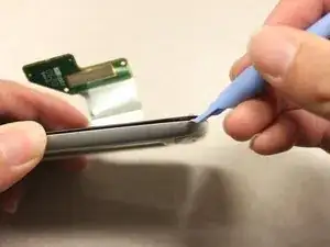 Вставьте пластиковый инструмент для вскрытия между передней и задней панелями и подденьте, чтобы получить доступ к экрану.
