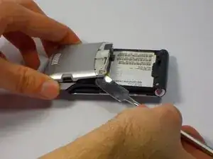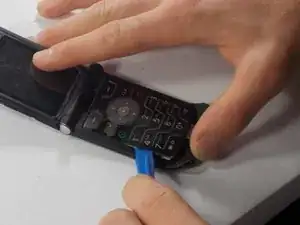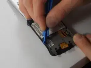 Используя пластиковый инструмент для открывания, нажмите четыре металлические защёлки вдоль кромки телефона внутрь по направлению к клавиатуре.