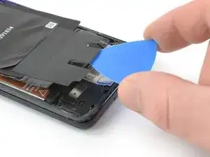 Проведите медиатором вдоль верхнего края телефона, чтобы перерезать клей.