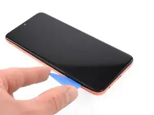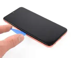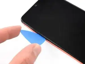 Вставьте открывающую лопатку между экраном и крышкой задней панели на левом крае рядом с отверстием для инструмента извлечения SIM.
