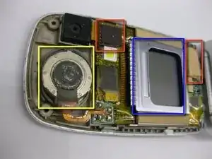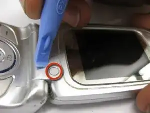 С открытым телефоном используйте лопатку, чтобы удалить четыре (4) резиновые вставки (одна показана красным кругом), расположенные возле углов лицевой панели с LCD-экраном.