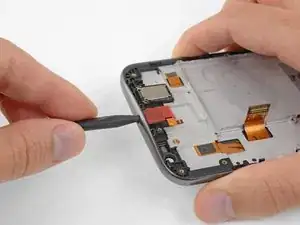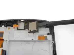 Вставьте лопатку под среднюю рамку в верхнем левом углу и аккуратно поверните, чтобы отделить её от корпуса телефона.