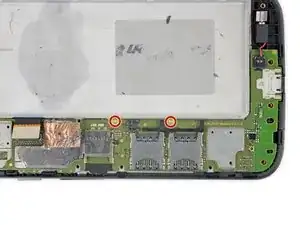Используйте отвёртку T3 Torx, чтобы выкрутить два бронзовых винта длиной 2,4 мм, фиксирующих материнскую плату.