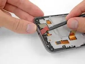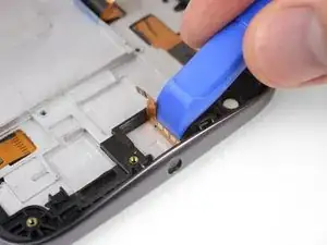 Засуньте острую кромку инструмента для вскрытия между гибким кабелем разъёма наушников и пластиковым каркасом, к которому он приклеен.