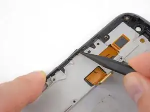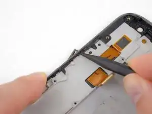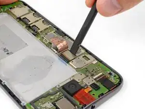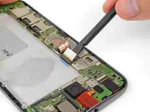 Используйте лопатку, чтобы отключить дисплей, поддев его разъём и отрывая его вертикально вверх от платы, со стороны, ближайшей к краю телефона.