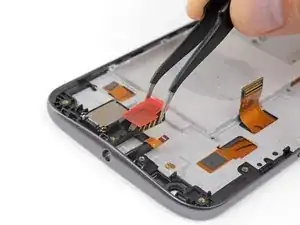 Пинцетом захватите гибкий кабель разъёма наушников и аккуратно вытяните его из разъёма при снятии платы.