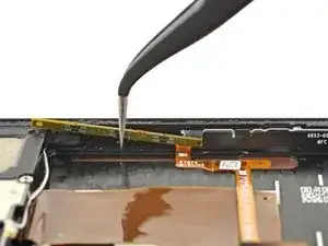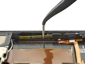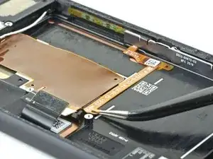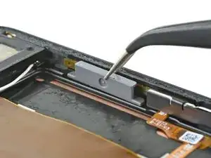 С помощью пинцета аккуратно отлейте шлейф датчика захвата от рамки телефона. Он закреплён лёгким клеем.
