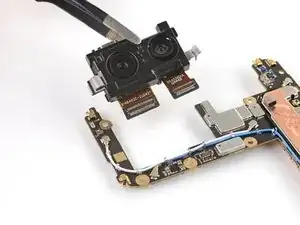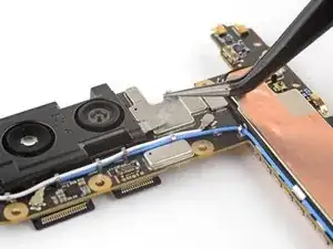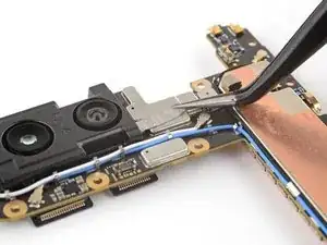 Используйте пинцет, чтобы отклеить серебристую токопроводящую плёнку, соединяющую кронштейн задней камеры с системной платой.