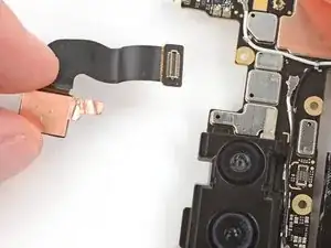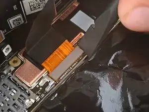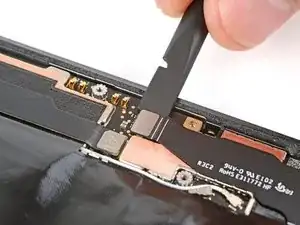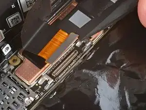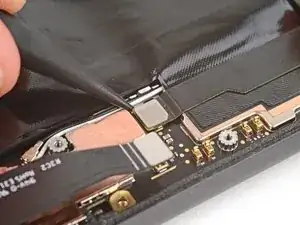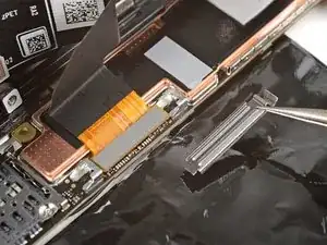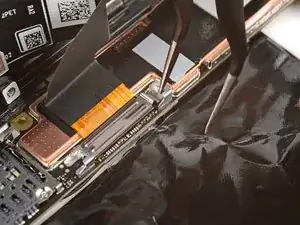 Вставьте плоский конец лопатки или чистый ноготь под верхний край шлейфа-разъёма дисплея и подденьте прямо вверх, чтобы отсоединить.