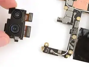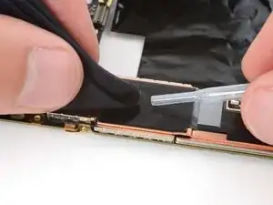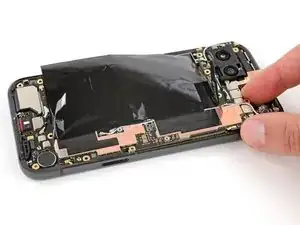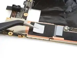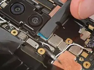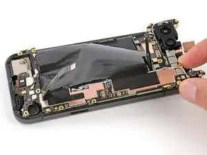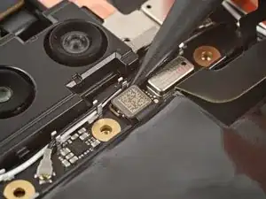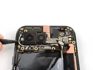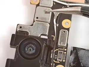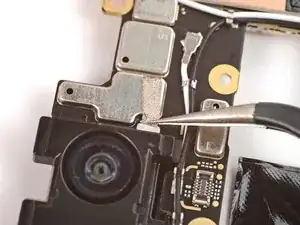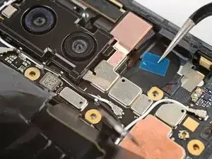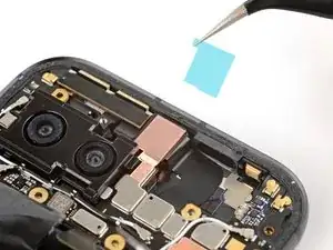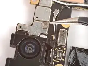 Если на плате логики осталась какая-либо токопроводящая лента задней камеры, с помощью пинцета удалите её.