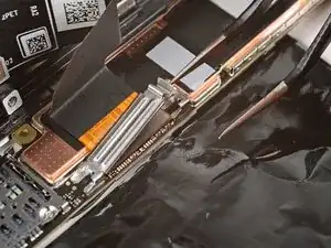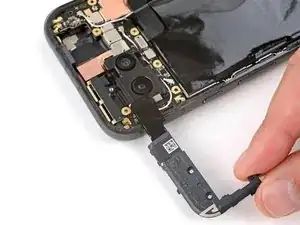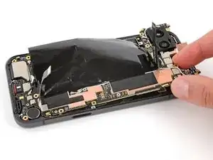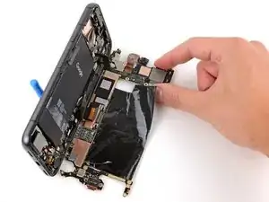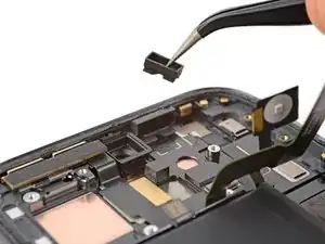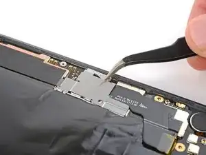 Удержание, создаваемое этим шлейфом, затрудняет его повторное подключение. При необходимости удерживайте среднюю часть шлейфа пинцетом, совместите его с разъёмом и нажмите вниз, чтобы зафиксировать.