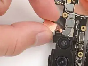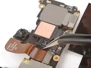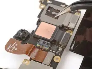 Если на плате логики осталась медная лента фронтальной камеры, с помощью пинцета удалите её.