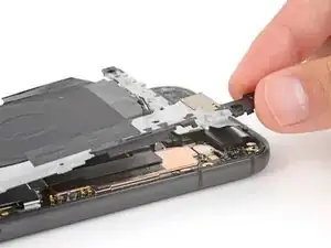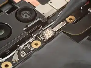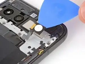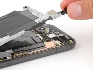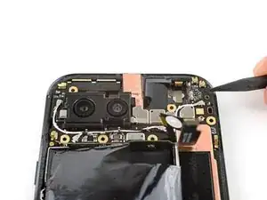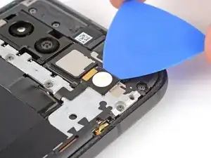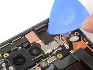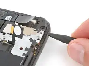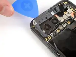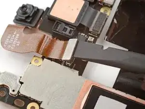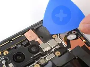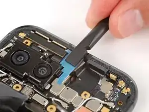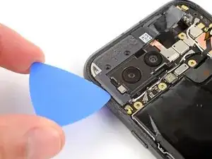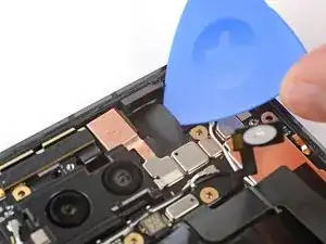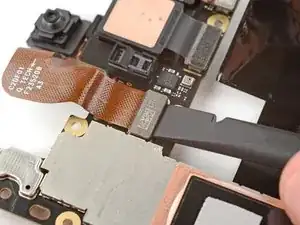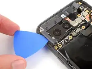 Вставьте кончик инструмента для вскрытия под правый край шлейфа фронтальной камеры и приподнимите его, чтобы отсоединить.