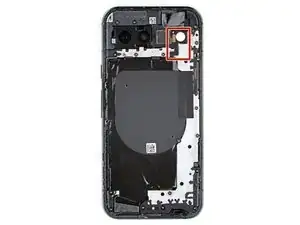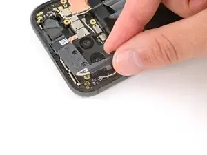 Используя пинцет, отклейте и удалите небольшой кусочек токопроводящей ленты с правого края корпуса задней камеры.