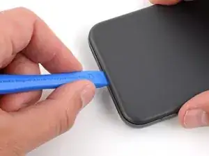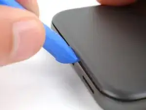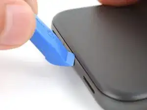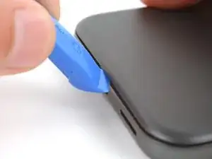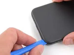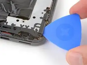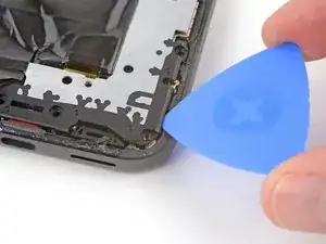 Проведите инструментом для вскрытия вокруг нижнего правого угла и вверх вдоль правого края, остановившись внизу выступа камеры.