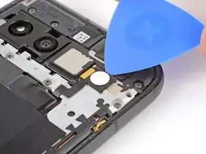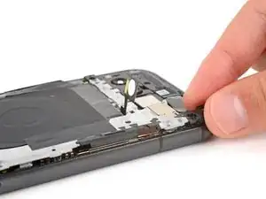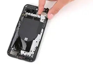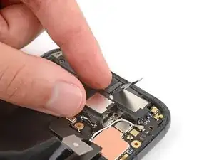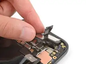 При установке динамика во время сборки убедитесь, что графитовая пластина не мешает. Затем вставьте динамик под наклоном вниз и продвиньте его к передней части телефона, чтобы уплотнитель вошёл в вырез корпуса.
