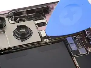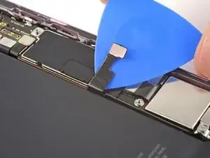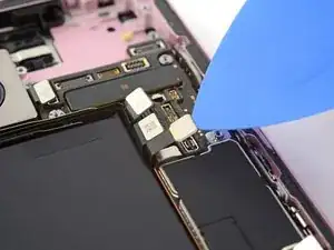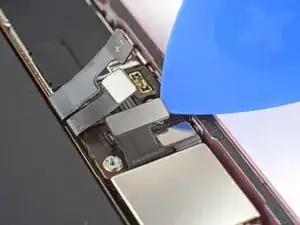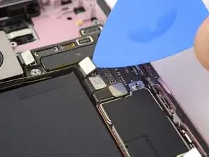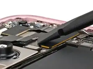 Используйте кончик медиатора, чтобы поддеть и отсоединить защёлкивающийся разъём экрана.