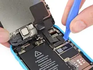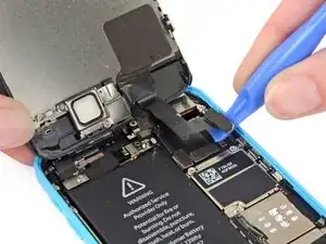 Используйте пластиковую лопатку, чтобы отключить переднюю камеру и разъём кабеля датчика.