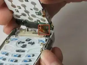 Аккуратно подденьте лопаткой логическую плату; обратите внимание на золотистую планку, которая соединяет плату с остальной частью телефона.