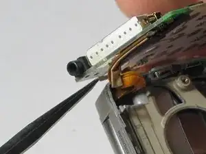 С помощью лопатки осторожно поднимите маленький фиксатор, удерживающий золотистую планку на логической плате.