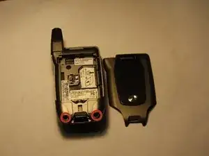 Снимите заднюю крышку телефона, отсоединив защёлку и приподняв крышку вверх.