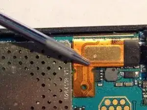 Найдите гибкий кабель LCD в верхнем левом углу платы и освободите его, поддев с левой стороны с помощью инструмента для поддевания.