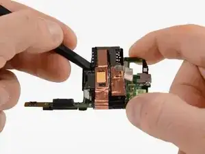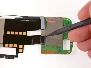 Воспользуйтесь лопаткой, чтобы отсоединить разъём лотка SIM-карты от материнской платы.