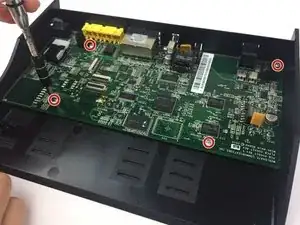 Используйте крестовую отвёртку Phillips №0, чтобы выкрутить четыре винта с крестообразной головкой (6 мм), отмеченные красными кружками.