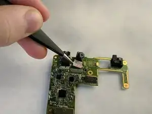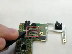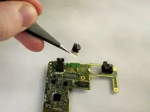 Камера слегка приклеена к материнской плате. Возможно, потребуется использовать пластиковую лопатку, чтобы ослабить клей под камерой.