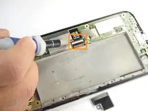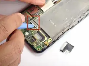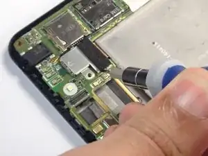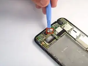 Используйте синюю пластиковую лопатку, чтобы аккуратно поддеть разъём камеры и приподнять его из гнезда на материнской плате.