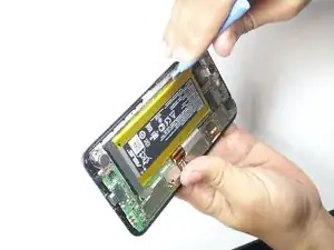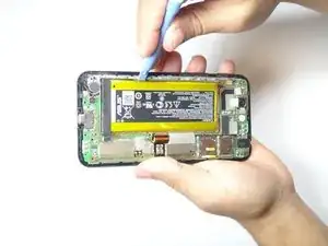 Используйте синюю пластиковую лопатку, чтобы поддеть аккумуляторный блок и оторвать его от корпуса. Подденьте вдоль края, отводя инструмент от материнской платы, чтобы не повредить плату.