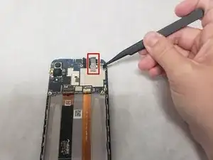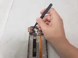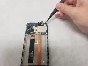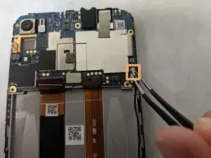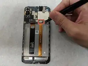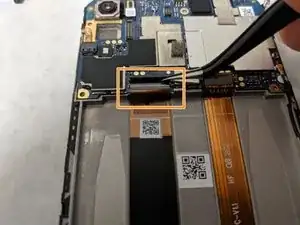 Используйте пинцет, чтобы отключить пресс‑фит разъём под лентой, прямо над серебристой пластиной.